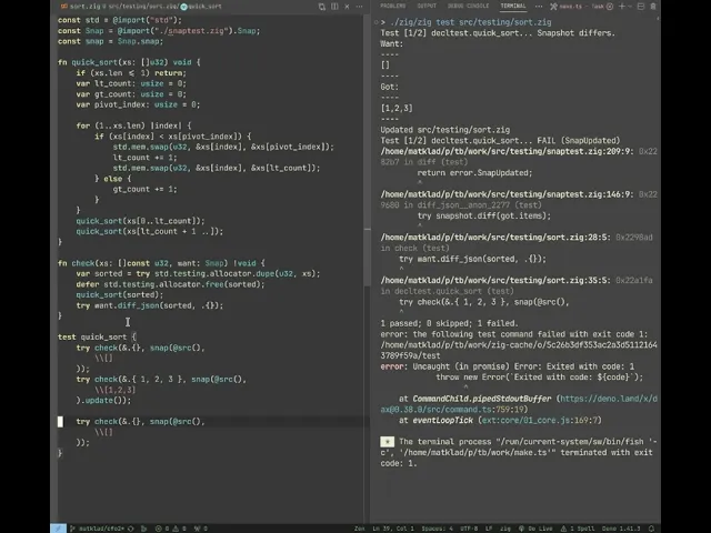 In case of a mismatch, it is helpful to print a proper diff. There’s a cheat code here: leveraging git. That is, just update the snapshots in-place and use git diff